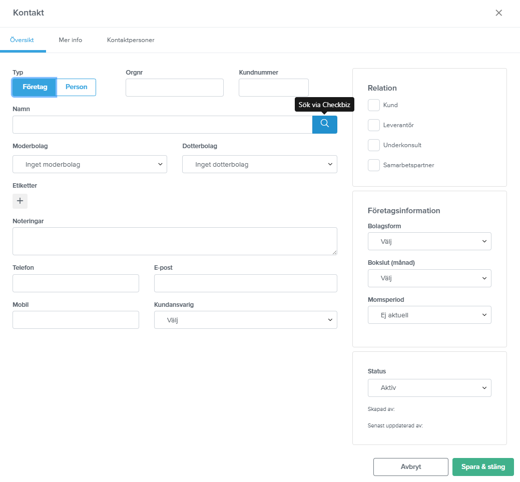 Med ett enkelt klick kan du importera företagsdata från CheckBiz i samband med att du lägger till en ny kund i Blikk.