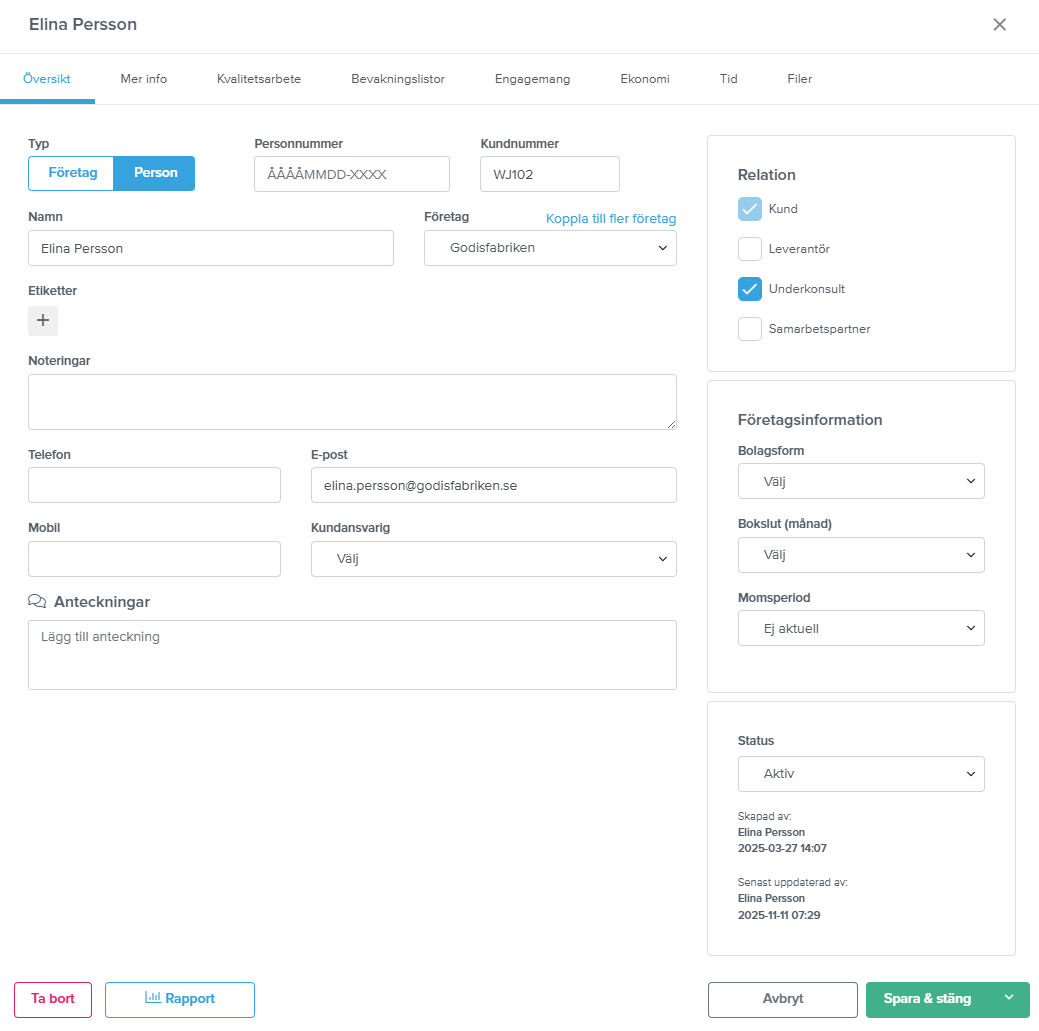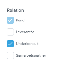 De relationer som finns att välja på är Kund, Leverantörer, Underkonsulter och Samarbetspartner.