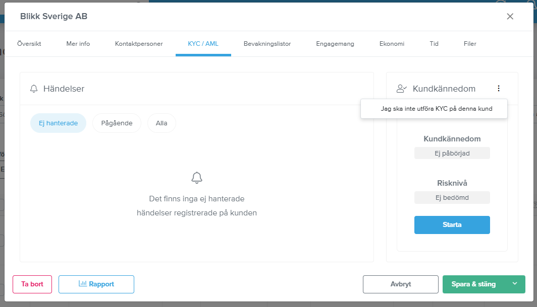 Vår rekommendation är att ni på varje utländsk kund ställer in att KYC inte ska utföras. Det görs via Kundkortet > KYC/AML > Klicka på de 3 prickarna, välj att ni inte ska utföra KYC.