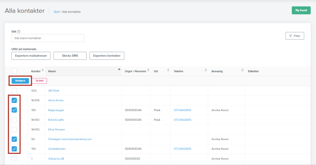 Om du vill göra likadana ändringar på flera kontakter på samma gång kan du välja att massredigera dem. Det gör du genom att gå till Kontakter i menyn och välja Alla kontakter, Företag eller Personer. Använd sökrutan eller ange filter vid behov.