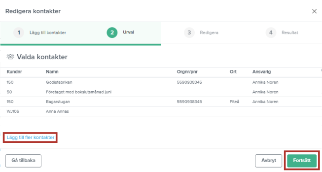 I vyn som kommer upp kan du välja Lägg till fler kontakter om du önskar. När du är nöjd med urvalet klickar du på Fortsätt.
