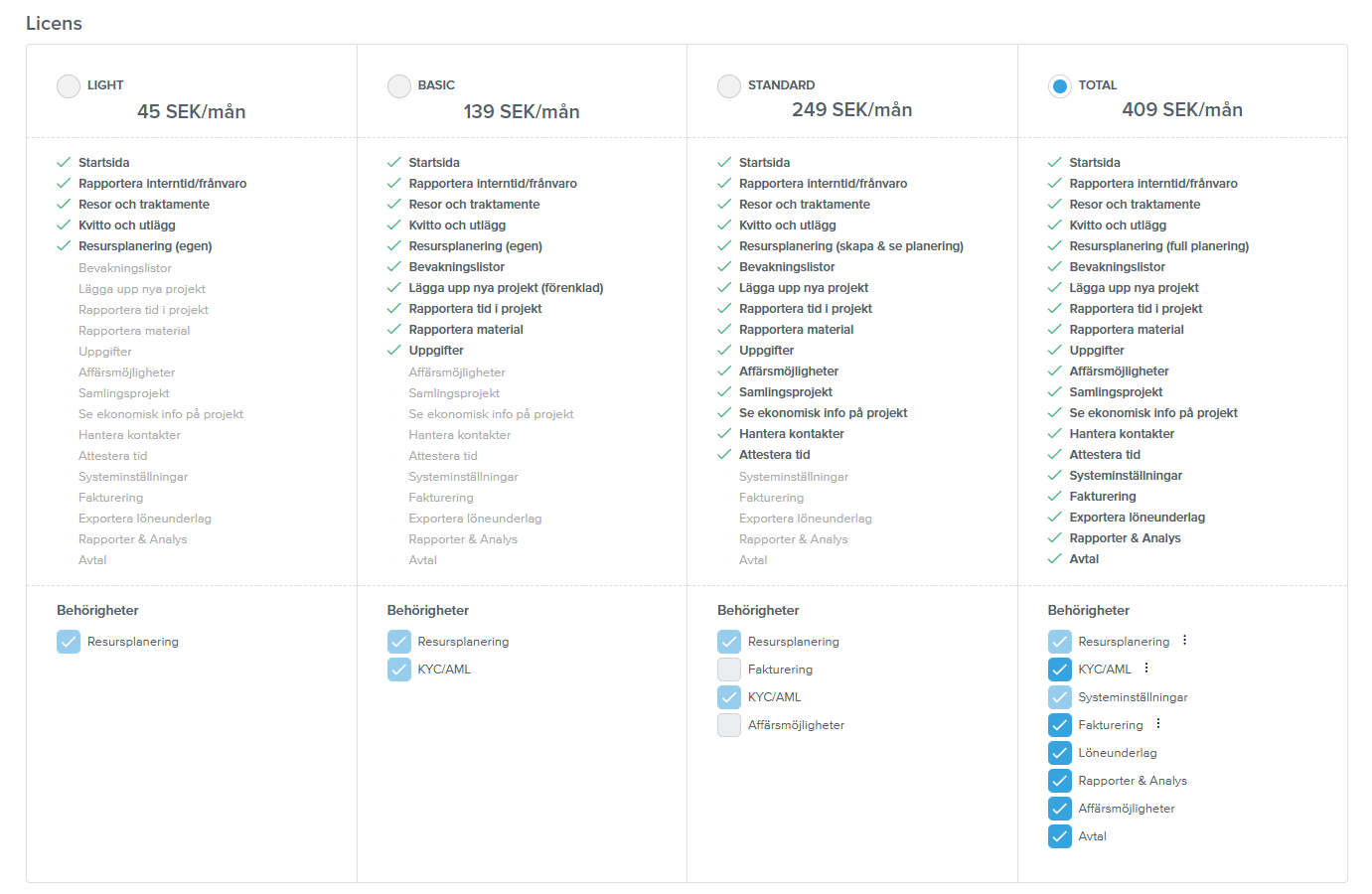 Användare med licenserna Basic, Standard och Total kan ges behörighet till KYC/AML-modulen.