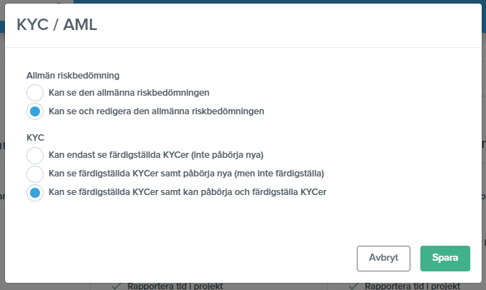 Förutom att ge användare tillgång till KYC/AML-modulen har du möjlighet att välja vad de ska kunna se och redigera i modulen.