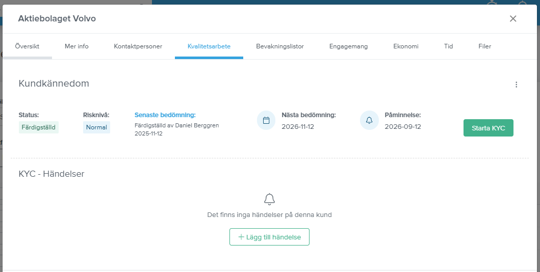 Händelser är ett samlingsnamn för alla viktiga händelser som rör din byrås allmänna riskbedömning och KYC:er. Det kan exempelvis innefatta påminnelser om att er allmänna riskbedömning måste förnyas eller förändringar i en kunds styrelse. En del händelser skapas automatiskt men du har även möjlighet att registrera egna händelser.