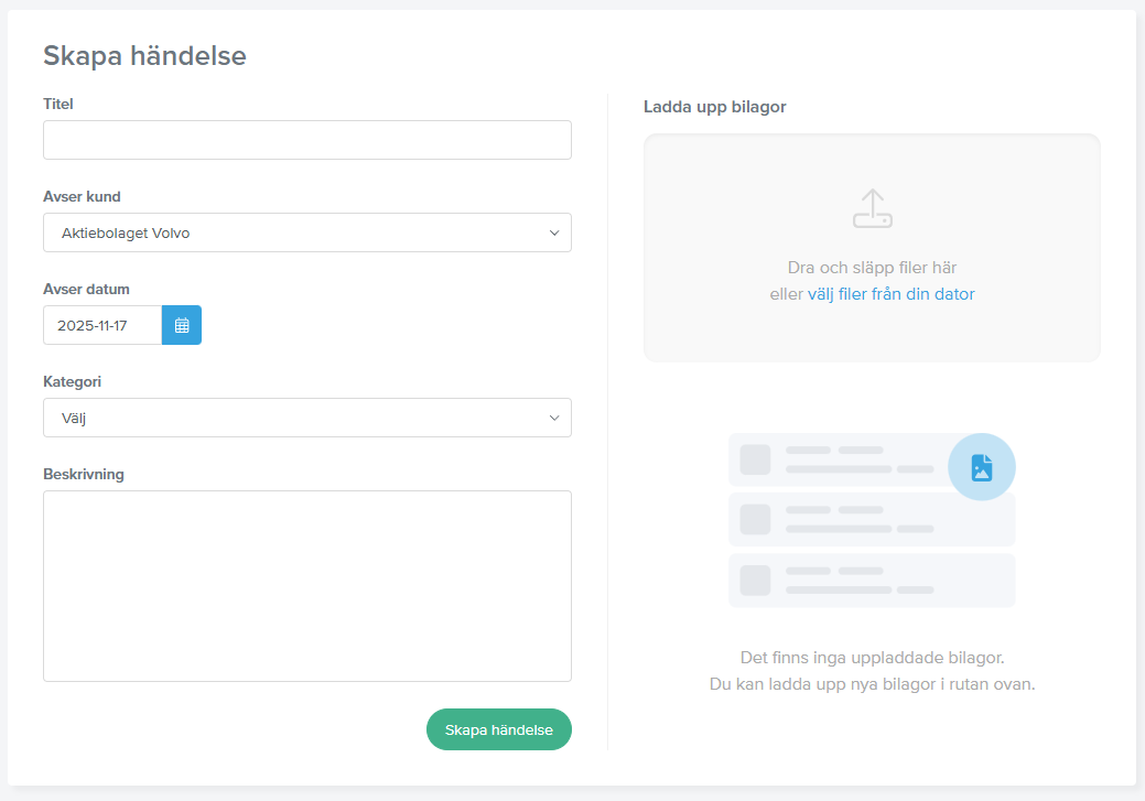 I samband med att du skapar en händelse måste du ange en titel, vilken kund händelsen avser, datum samt kategori (Förändring, Misstänkt aktivitet eller Allvarlig risk). Du har även möjlighet att komplettera med en beskrivning samt ladda upp filer: