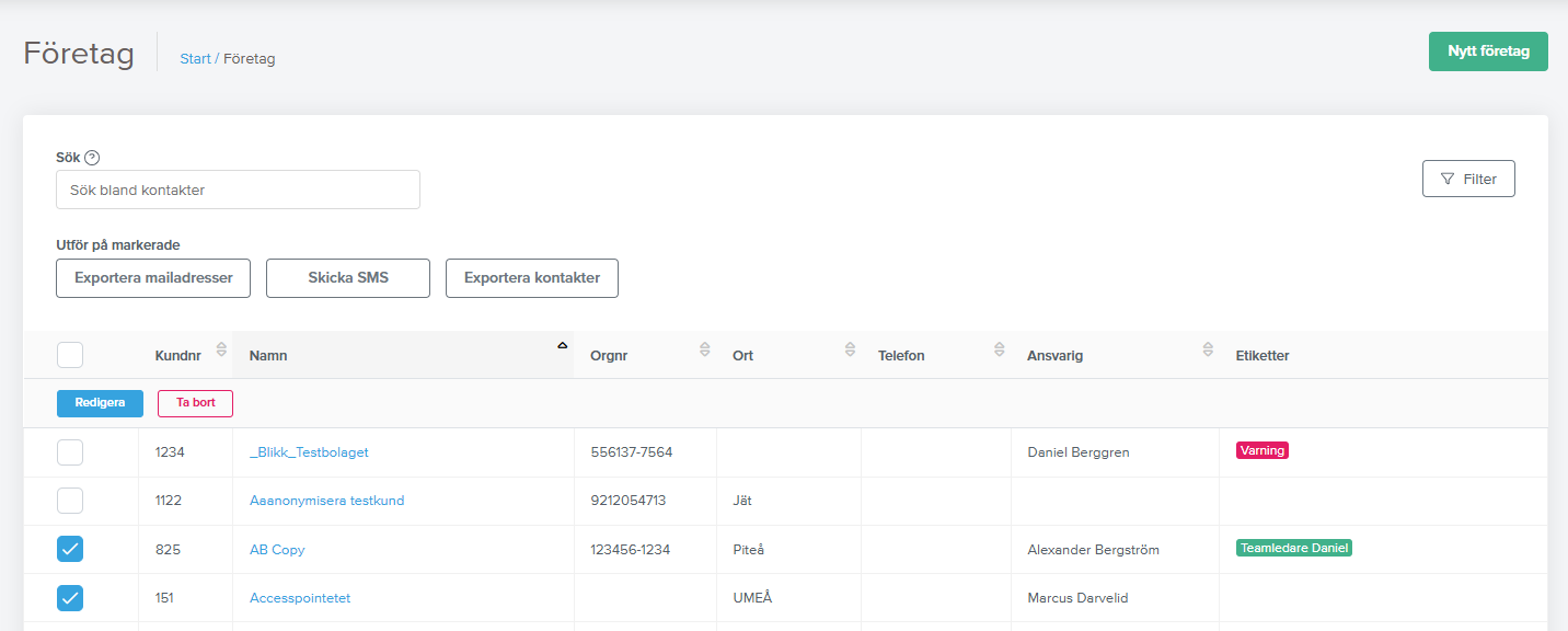 Gå till Kontakter > Alla kontakter eller Kontakter > Medarbetare. Här söker du fram den kontakt som du önskar att skicka SMS till, bocka i rutan framför kunden/medarbetaren, välj Skicka SMS.