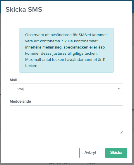Efter du klickat på Skicka SMS får du upp en ruta där du skriver in ditt meddelande, tryck därefter på Skicka.