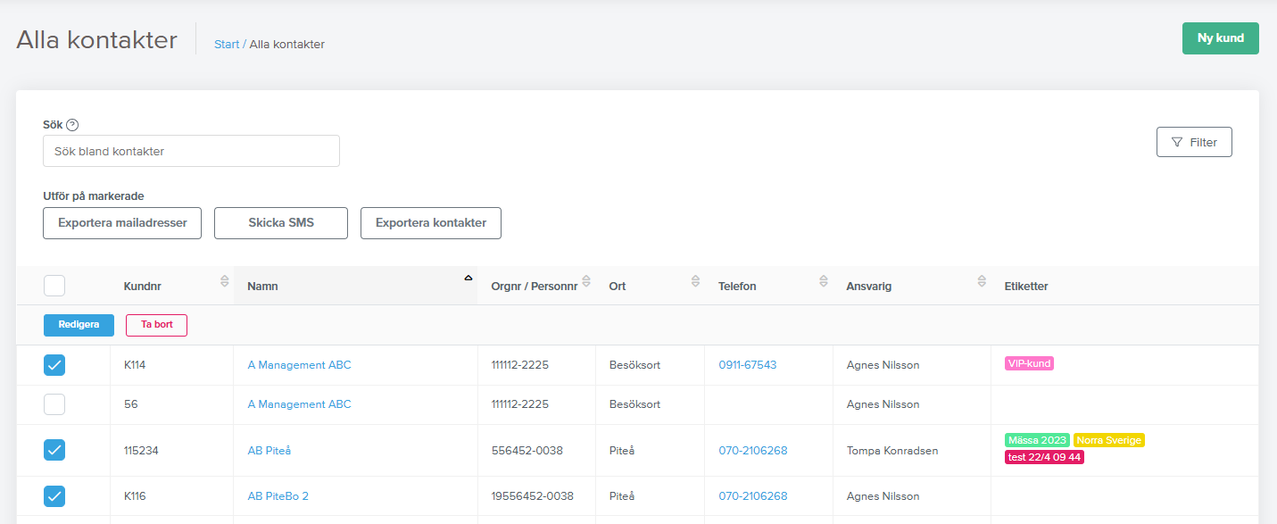 Om du vill göra likadana ändringar på flera kontakter på samma gång kan du välja att massredigera dem. Det gör du genom att gå till Kontakter i menyn och välja Alla kontakterFöretag eller Personer. Använd sökrutan eller ange filter vid behov.