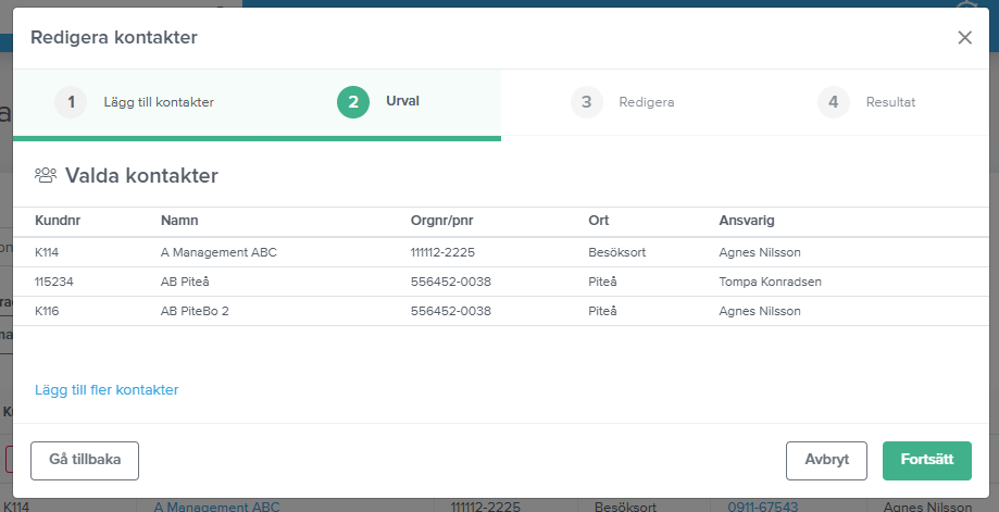 I vyn som kommer upp kan du välja Lägg till fler kontakter om du önskar. När du är nöjd med urvalet klickar du på Fortsätt