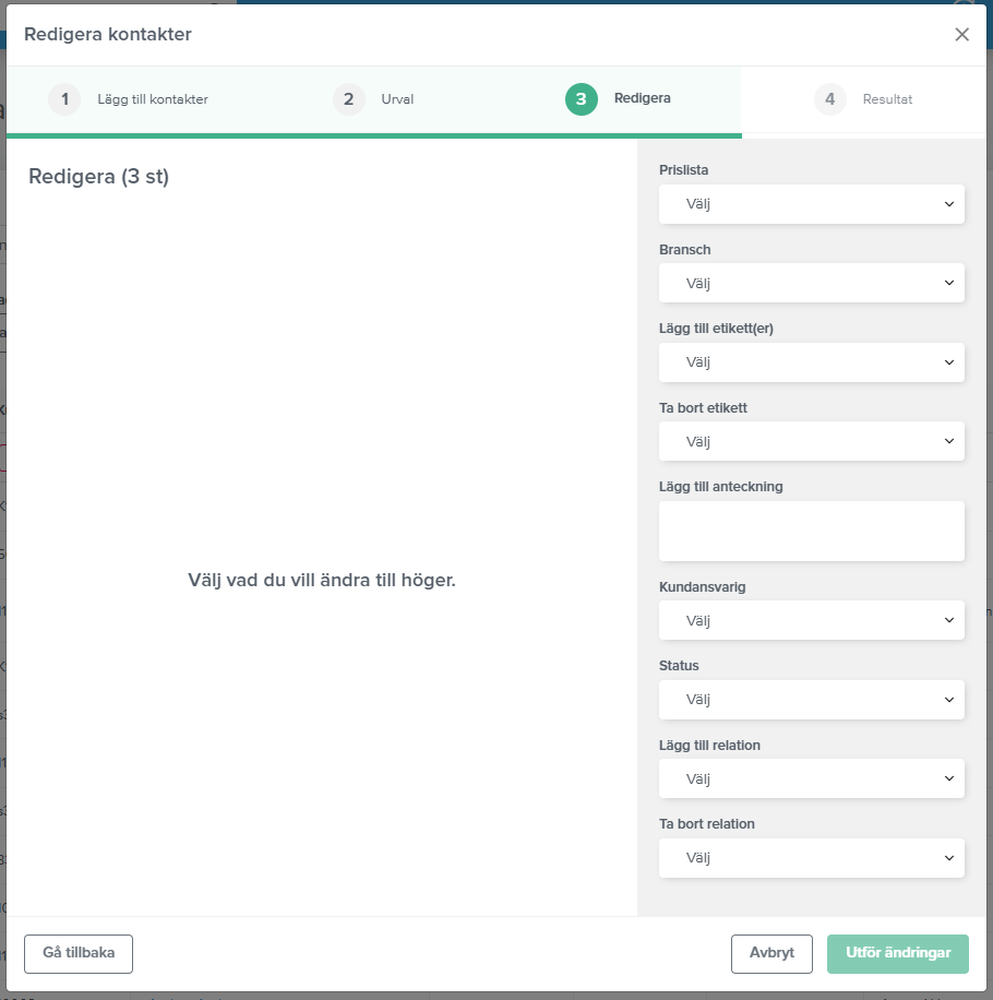 Välj vilka ändringar du vill göra på markerade kontakter. Du kan göra flera ändringar på samma gång. De ändringar du kan göra är: Prislista, bransch, lägg till etikett, ta bort etikett, lägg till anteckning, kundansvarig, status, lägg till relation, ta bort relation.