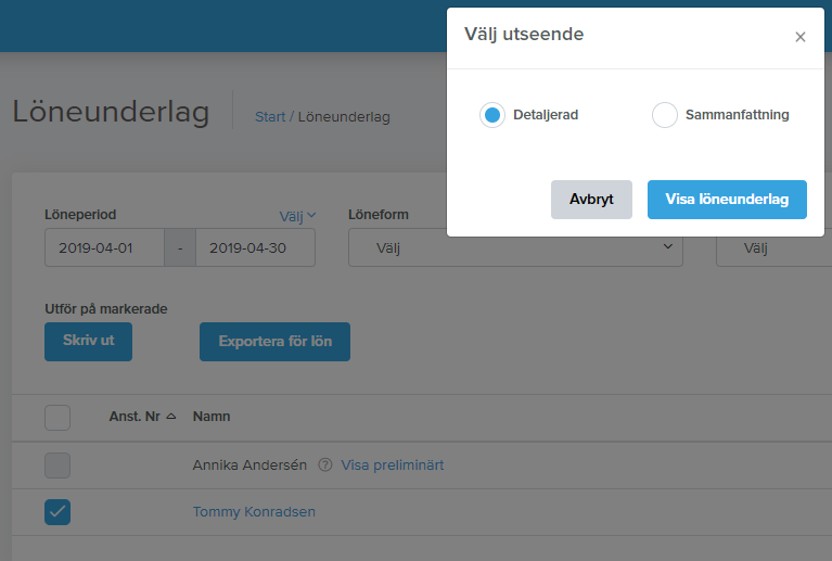 Gå till Tid & Kvitton > Löneunderlag markera den/de anställda som du vill ta ut löneunderlag för. Klicka sedan på Skriv ut och välj utseende, tryck så på Visa löneunderlag.